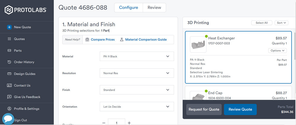 4. Updated pricing based on your selections is reflected in your quote. With 3D printing, see instantly how changes in additive materials and resolution levels impact pricing