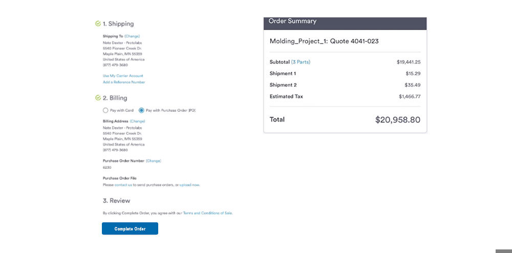 1. Part design is optimized with any modifications addressed, and your pricing and shipping details are in order, just hit Checkout Now in the Review & Order page