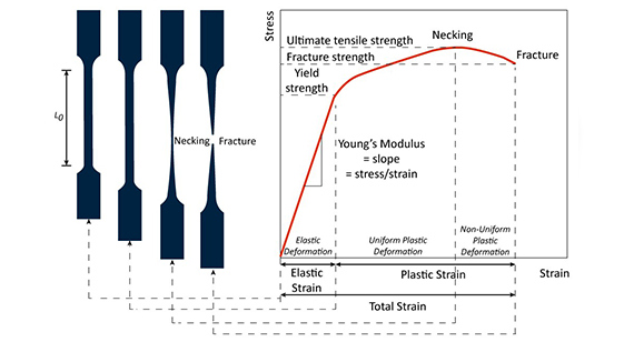 Si misurano la forza, lo spostamento e la deformazione (quanto il materiale si allunga) e le curve sforzo-deformazione vengono visualizzate graficamente per mostrare le molteplici proprietà dei materiali.