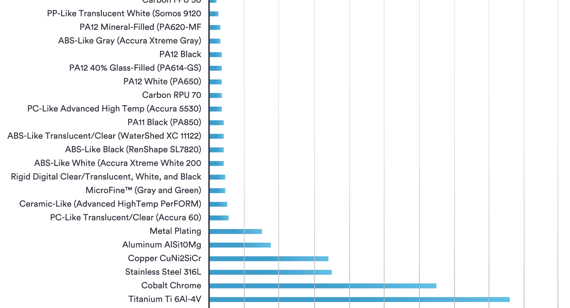 Il grafico a sinistra (clicca per ingrandire) mostra una rappresentazione dei materiali di Protolabs e la relativa resistenza alla trazione.