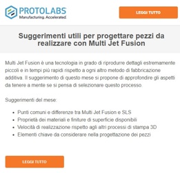 La nostra newsletter con i Suggerimenti di Progettazione arriverà una volta al mese, fornendo utili consigli e suggerimenti su qualunque argomento, dalla scelta dei materiali alla progettazione di pezzi stampati a iniezione con l'impiego di camme, chiusure, cerniere integrali e molto altro.