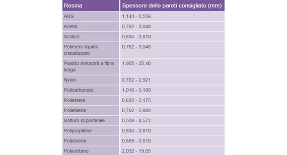 Il controllo dello spessore della parete durante la progettazione di un pezzo contribuisce a gestirne l'estetica, il peso e la robustezza. I pezzi troppo spessi presentano depressioni, antiestetiche, deformazioni e vuoti interni (tasche o bolle d'aria). Per evitare questi inconvenienti, sono state stabilite linee guida per lo spessore delle pareti dei materiali; occorre però ricordare che questa è una regola generale in quanto non tutti i pezzi possono presentare spessori di parete compresi tra quelli indicati in tabella.