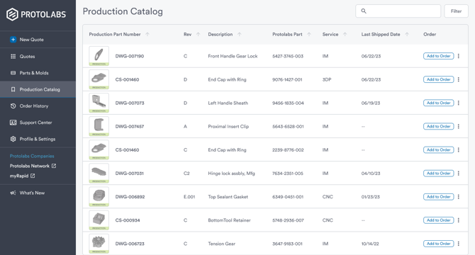 expand_less expand_moreNo. The Production Catalog is a tool to reorder your production parts in an easy and reliable way across team members. You can continue to order parts from Protolabs without using the Production Catalog.