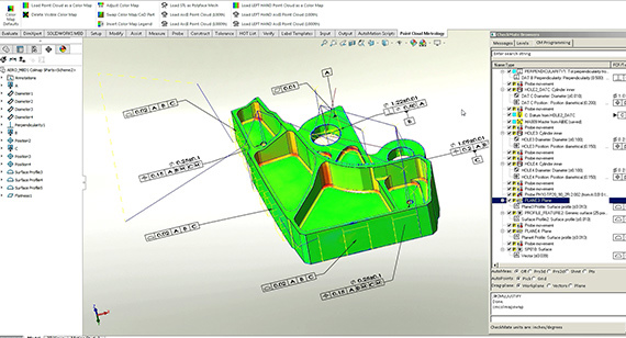 What about inspection? Acting upon 3D geometric dimensioning and tolerancing (GD&T), CheckMate can automatically program coordinate measuring machine (CMM) paths and soft gauges. Plus, the CMM sample points or a 3D-scanned point cloud can be overlaid on top of and compared with the nominal CAD model. Then, CheckMate automatically generates a quality heat map per the intelligent 3D GD&T as shown in Figure 4.