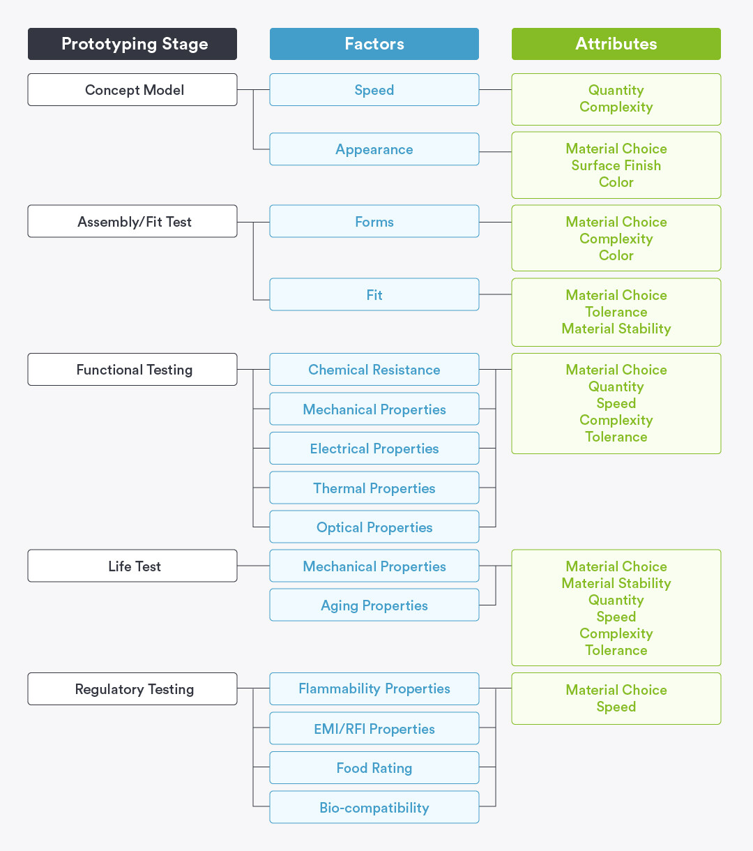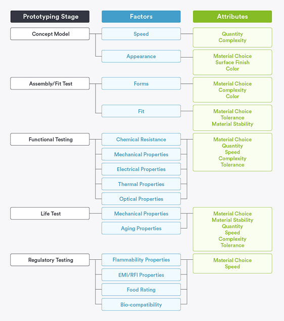 Use the decision tree below to narrow down which factors are of highest importance to you based on where you are in the prototyping process, referring as needed to the definitions below this decision tree infographic.