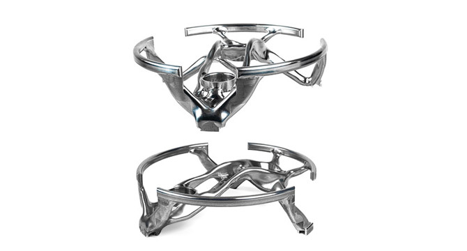 The generative-designed part has breaks in the circular design, shedding hours of milling time by allowing for simpler 2-axis milling.